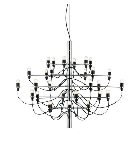 Beeindruckender Designer-Kronleuchter von Flos, Modell 2097/30, entworfen von Gino Sarfatti. Diese ikonische Lampe ist ein echter Blickfang und vereint industrielle Eleganz mit zeitlosem italienischem Design. Perfekt als Blickfang über dem Esstisch, im Loft oder in einem hohen Flur.