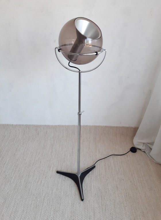 Wunderschöne Raak Stehleuchte mit Kugel. Diese Stilikone wurde in den 1950er Jahren von Frank Ligtelijn für die Firma Raak in Amsterdam entworfen. Die Idee der Aluminiumhalterung, über die eine Glaskugel gestülpt wird, wurde in verschiedenen Versionen hergestellt (Hängeleuchten, Wandleuchten, Stehlampen). Das verwendete Glas wurde in drei Farbtönen hergestellt: grau-violett, braun geräuchertes Glas und klar. Die Lampen aus dieser Serie wurden bis in die 1970er Jahre hergestellt. Die hier angebotene Lampe ist eine Stehlampe aus braunem Rauchglas. Die Leuchte ist höhenverstellbar und steht auf einem Sockel aus Gusseisen. Die Lampe hat eine E27-Fassung und ein schwarzes Kabel mit Schalter und einem weißen europäischen 2-Pin-Stecker. Abmessungen: Minimale Höhe: 120 cm. Maximale Höhe: 165 cm. Breite der Lampenfassung: ca. 27 cm. Tiefe der Glühbirnenfassung: ca. 24,5 cm. Durchmesser des Sockels: ca. 42 cm. Die Lampe ist in einem guten Vintage-Zustand. Foto 10 zeigt diese Lampe zusammen mit zwei Pendelleuchten aus der gleichen Serie, die wir ebenfalls anbieten (falls nicht verkauft).