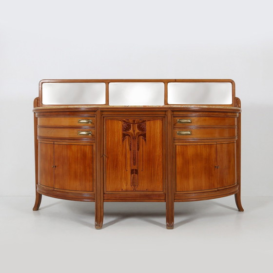 Frankreich / 1911 / Anrichte / Maurice Dufrène / Nussbaum, Marmor, Spiegel, Bronze / Jugendstil / Art Déco Atemberaubende halbkugelförmige Anrichte im Jugendstil des französischen Designers Maurice Dufrène. Diese Anrichte ist aus massivem Nussbaumholz gefertigt und verfügt über schöne Holzintarsien, eine beigefarbene Marmorplatte, Bonze-Beschläge und ein Spiegel-Triptychon auf der Oberseite. Auf der linken und rechten Seite befinden sich 2 mondförmige Schubladen und darunter zweitürige Fächer mit je einem Einlegeboden. Das mittlere und größte Fach hat einen Einlegeboden und eine schöne, mit Intarsien verzierte Tür. Die geometrischen Linien und die reichhaltigen Verarbeitungen verkörpern den zeitlosen Charme des Jugendstils und machen ihn zu einem besonderen Stück. Dieser Schrank wurde 1911 auf dem "Salon des Artistes Décorateurs" ausgestellt. Maurice Dufrène ist ein französischer Kunsttischler, Innenarchitekt, Chefdekorateur und Autor von Werken über Dekoration. Er wurde 1876 in Paris geboren und starb 1955 in Nogent-sur-Marne. Höhe: 102-131 cm