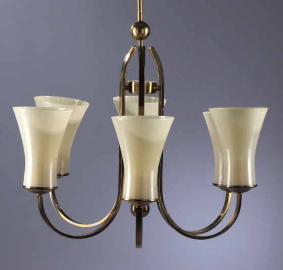 Dieser exquisite französische Art-Déco-Kronleuchter besticht durch eine atemberaubende Kombination aus Gold- und Cremetönen und verkörpert die Eleganz und Raffinesse der Art-Déco-Ära. Er ist aus hochwertigem Metall und Glas gefertigt und besticht durch sein zeitloses Design mit fünf anmutig geschwungenen Armen und schön geformten Glasschirmen. Dieser Kronleuchter eignet sich perfekt, um jedem Raum einen Hauch von Vintage-Charme zu verleihen. Er ist ein echtes Statement, das Ihre Inneneinrichtung aufwertet.