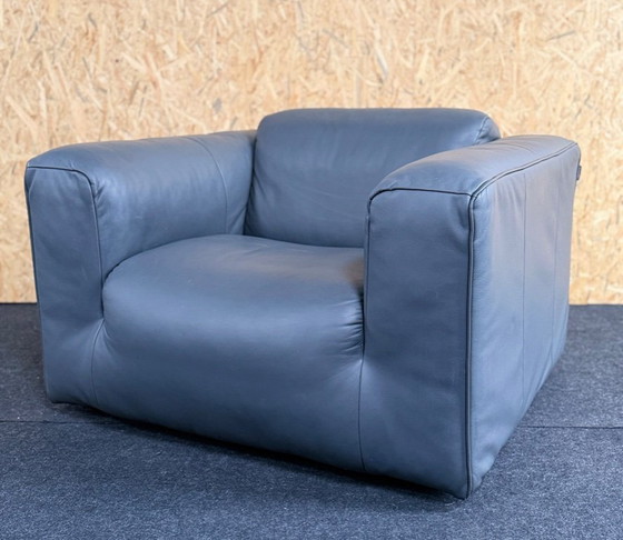 Der Sessel Freistil Rolf Benz ist mit echtem Leder bezogen und steht auf schwarzen Beinen. Er zeichnet sich durch sein solides, kompaktes Design und seine elegante, minimalistische Optik aus.