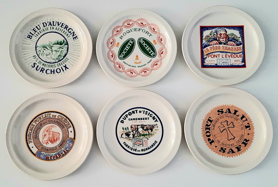 6 verschiedene Käseteller, jeder mit einer bekannten Käsesorte. Sie sind farbenfroh und auch schön als Frühstücks- oder Kuchenteller. Normale unauffällige Gebrauchsspuren, keine Chips oder Kratzer.