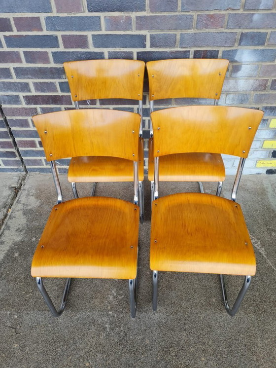 Exquisites Set aus vier funktionalistischen Rohrrahmenstühlen aus den 1930er Jahren. Diese Stühle verkörpern die Eleganz und Schlichtheit des Funktionalismus und bieten eine perfekte Verbindung von Form und Funktion, die jeden Raum aufwertet.