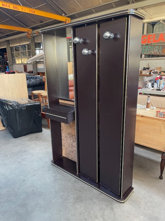 Dieser Garderobenschrank im italienischen Mid-Century-Modern-Stil der 1960er-Jahre vereint Funktionalität mit klassischem Design. Seine elegante braune Oberfläche verleiht ihm zeitlose Schönheit und macht ihn zur perfekten Ergänzung für jeden Eingangsbereich. Ausgestattet mit verchromten Haken und einem praktischen Schrankfach mit drehbaren Ablagen und Spiegel, ist er gleichermaßen stilvoll und praktisch. Verleihen Sie Ihrem Zuhause mit diesem einzigartigen Möbelstück einen Hauch von Vintage-Eleganz.