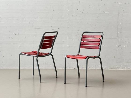 Die Atelier Alinea Gartenstühle aus Schweizer Produktion überzeugen durch ihre zeitlose, klassische und zugleich funktionale Gestaltung, die sich harmonisch an nahezu jeden Gartentisch einfügt. Das feuerverzinkte Stahlrohrgestell sorgt für hohe Stabilität, Witterungsbeständigkeit und eine langlebige, robuste Anmutung. Sitz- und Rückenlatten sind aus wetterfestem Eschenholz gefertigt und waren ursprünglich sowohl natur imprägniert als auch farbig lackiert erhältlich – hier in einer rot lackierten Ausführung. Die leicht geschwungene Sitzfläche bietet angenehmen Sitzkomfort, während die verschraubten Metallträgerleisten unter Sitz und Rücken die solide, für den Aussenbereich konzipierte Konstruktion unterstreichen. Durch die stapelbare Bauweise eigneten sich diese Modelle besonders für Gastronomie, Freibadanlagen und öffentliche Aussenräume. Die klare Linienführung und die materialehrliche Verarbeitung machen die Stühle zu einem charakteristischen Vertreter des funktionalen Schweizer Outdoor-Designs der 1970er Jahre mit dauerhaftem Gestaltungsanspruch.
