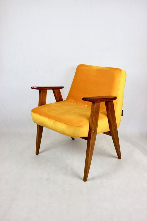 Top Polish 366 Vintage-Sessel in Gelbgold aus den 1970er Jahren im Vintage-Stil Design von Jozef Chierowski, komplett restauriert - neue Polsterung mit Samtstoff aus der Serie Paris. Holzelemente mit Armlehnen in dunkler Buchefarbe lackiert.