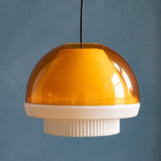 Attraktive Space Age Pendelleuchte aus den 1970er Jahren. Die Leuchte besteht aus zwei Kunststoffteilen: einem weißen, gerippten Sockel und einem bernsteingelben, durchscheinenden Schirm. Zusammen erzeugen sie einen wunderschönen warmen Lichteffekt, wenn die Leuchte eingeschaltet ist.