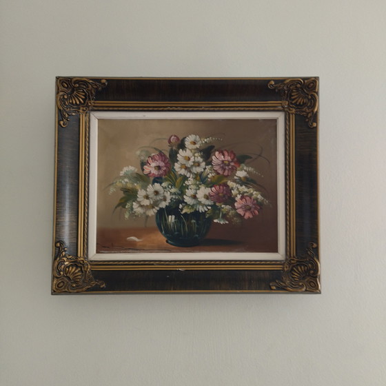 Dieses Gemälde zeigt einen wunderschönen Blumenstrauß in einer Vase, eingerahmt in einen Holzrahmen mit goldenen Details. Die kräftigen Farben und die klassische Komposition machen es zu einem idealen Stück, um jeder Einrichtung einen Hauch von Eleganz zu verleihen.