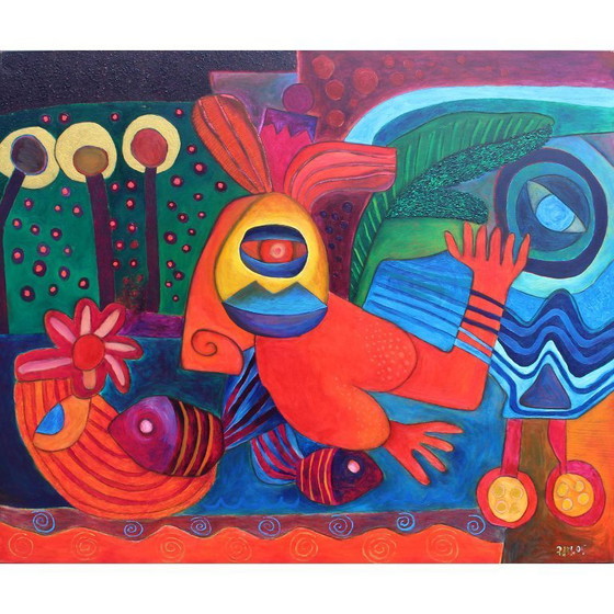 Dieses beeindruckende, surreale Gemälde ist eine wahre Farbexplosion. Es zieht sofort die Blicke auf sich durch seine kraftvollen Kontraste: Leuchtende Rot-, Orange- und Gelbtöne heben sich wunderschön von den tiefen, geheimnisvollen Blau- und Grüntönen ab. Mit seinen traumhaften Figuren, organischen Formen und dem verspielten, fast an CoBrA erinnernden Ausdruck ist es ein Gemälde, in dem Sie immer wieder neue Details entdecken werden.