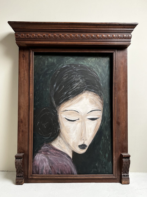Wunderschönes Ölgemälde auf Holz, das eine Frau vor dunklem Hintergrund zeigt, gefasst in einem aufwendig gestalteten Holzrahmen. Das Gemälde ist 91 cm hoch und 61 cm breit. Der Rahmen misst 115 cm in der Höhe und 90 cm in der Breite. Das Gemälde kann auch ohne Rahmen erworben werden.