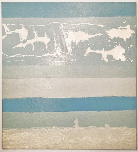 Acrylfarbe auf Leinwand, keine Latten drum herum, guter Zustand, auf der Rückseite vom Künstler signiert, überwiegend blau, grau und weiß. Hat große räumliche Wirkung auch in einem kleinen Raum. Musste wegen Platzmangels verkaufen. Van Gestel hat in der ganzen Welt ausgestellt: Paris,