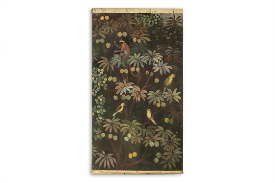Bemaltes Leinwandbild mit einem Affen, zwei Vögeln und einem Papagei vor dem Hintergrund eines exotischen Waldes. Arbeit eines zeitgenössischen französischen Künstlers. Maße: H 220 x L 120 cm Referenz: LS61291089I Wir besitzen ein weiteres Leinwandbild, das es ermöglicht, ein Paar zu bilden! Rohe Leinwand aus Leinen, handbemalt mit natürlichen Pigmenten und goldenen Motiven, die mit Kupferfolie hergestellt wurden. Die Leinwand ist mit zwei Holzstäben gespannt, von denen der untere abnehmbar ist, sodass sie für den Transport zusammengerollt werden kann.