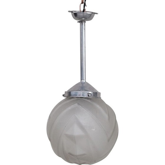 Eine Pendelleuchte aus geätztem Glas, die an einem festen Metallstiel befestigt ist. Der Stiel kann durch einen Haken ersetzt werden, so dass die Lampe an einer Kette befestigt werden kann, was wir auf Anfrage organisieren können. Frankreich, um 1930. Ungewöhnliche Form des Glasschirms. Seitdem wieder angeschlossen und PAT-geprüft. Die Lampe ist in gutem Zustand, einige Kratzer und Patina, dem Alter entsprechend. Standort: Belgien Galerie. Abmessungen : 44 H x 20 Durchmesser in cm. Lieferung : POANWir können weltweit versenden. Kann zu unserem London oder Belgien Galerie übertragen werden.