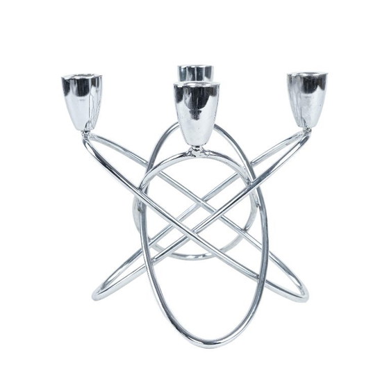 Ein geometrischer Kerzenständer aus der Mitte des 20. Jahrhunderts, hergestellt aus verchromtem Metall. Seine minimalistische, skulpturale Form im Stil der Moderne macht ihn sowohl zu einem dekorativen als auch zu einem funktionalen Element der Inneneinrichtung. Ideal für Vintage-, Mid-Century- oder moderne Interieurs.