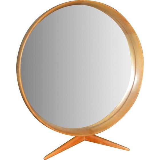 Dieser holzgerahmte Tischspiegel wurde von Uno und Osten Kristiansson entworfen und 1960 von der schwedischen Firma Luxus hergestellt. Er besteht aus einem Ständer und Rahmen aus Eichenholz mit einem runden Spiegel. Dieser Artikel ist in gutem Originalzustand.