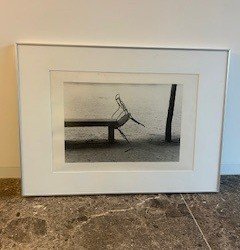 Vintage-Poster, gerahmt in alufarbenem Metallrahmen mit weißem Passepartout. Klares Glas. Fotografie von Eva Rubinstein mit dem Titel Tilted Chair, Paris 1968. Das Plakat stammt aus der Zeit um 1970-1980. Der Rahmen ist +/- 70 x 50 cm groß. Foto 40 x 27 cm. Passepartout 50 x 34 cm.