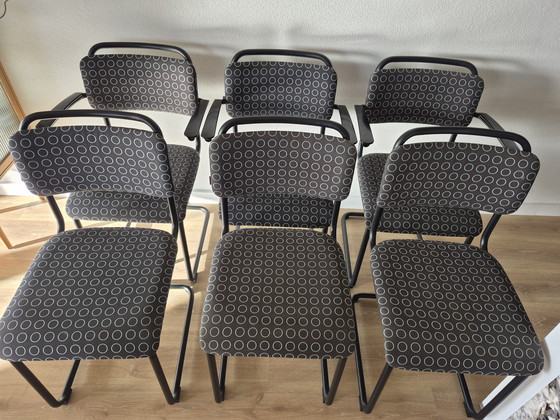 Gispen Dutch Original, drei Stühle 101XL und drei Stühle 201XL (mit Armlehnen). Schwarzes Gestell. Der Bezug ist eine limitierte Edition, Repertoire Dot Ring, Farbe 011 Coral Reverse. Die Stühle sind mit Bodengleitern ausgestattet. Alle Stühle haben eine Originalnummer. Leider weist ein Stuhl leichte Lackschäden auf (siehe Foto 5). Ansonsten sind die Stühle in sehr gutem Zustand.