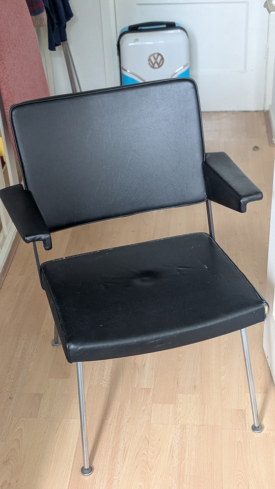 Dies ist ein klassischer Gispen 1445 Stuhl, entworfen von Andre Cordemeyer in den 1960er Jahren. Er verfügt über einen eleganten Sitz und eine Rückenlehne aus schwarzem Leder, die von einem robusten Metallrahmen getragen werden. Der Stuhl verkörpert den Mid Century Modern-Stil und ist damit ein zeitloses Möbelstück für jede Einrichtung. Sein minimalistisches Design und die hochwertigen Materialien sorgen für Komfort und Langlebigkeit.