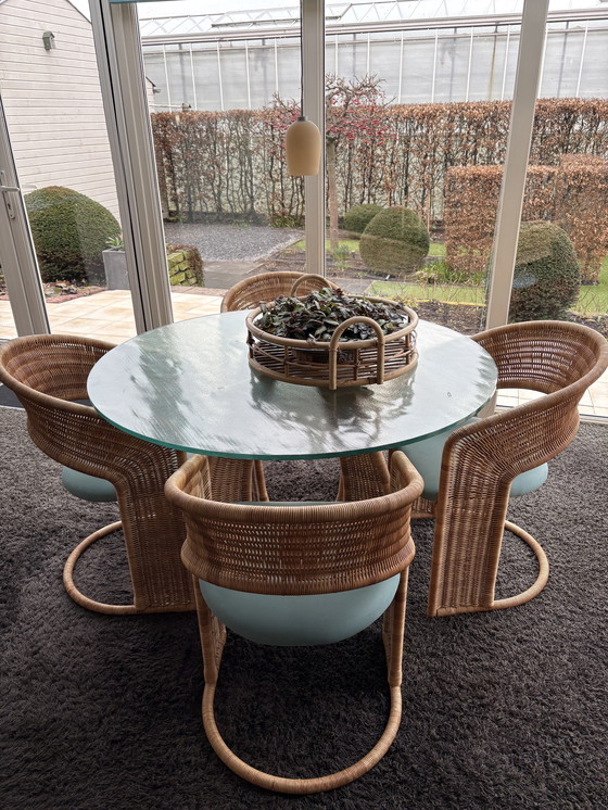 Erleben Sie unvergessliche Momente beim Essen mit diesem exquisiten runden Glastisch und den vier eleganten Stühlen. Die transparente Glasplatte des Tisches besticht durch ihre moderne und elegante Ästhetik, die perfekt mit der natürlichen Wärme der Rattanstühle harmoniert. Ob leger oder festlich – dieses Set wird in jedem Essbereich zum Blickfang.