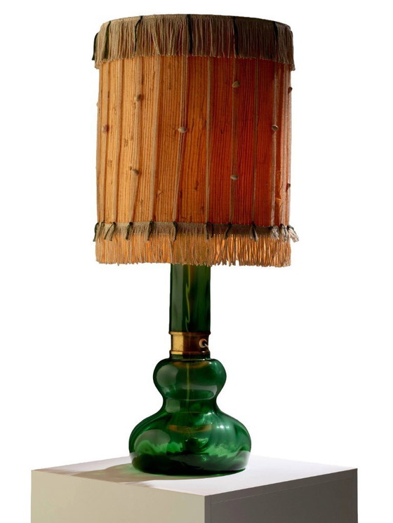 Die Leuchte verfügt über einen Sockel aus grünem, mundgeblasenem Glas und einen Textilschirm mit Fransenverzierung. Sie enthält zwei Glühbirnen mit Einzelschaltern. Die Materialien sind unbeschädigt und zeugen von sorgfältiger Konservierung.