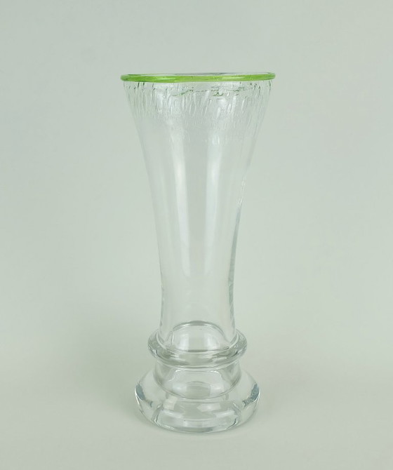 Glasvase aus den 1970er Jahren von Eisch, dickes Klarglas und Blasenglas, grüner Rand