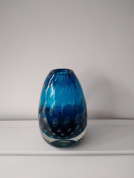 Hellblaue, unsignierte Glasvase mit Blasenmuster. Die Blasen schimmern silbrig durch metallische Partikel (Aventurin). Lediglich leichte Gebrauchsspuren an der Unterseite, ansonsten in exzellentem Zustand. Sie reflektiert das Licht wunderschön. Ich kann nicht sagen, ob die Vase aus Glas oder Kristall ist; sie ist recht schwer (1700 Gramm).