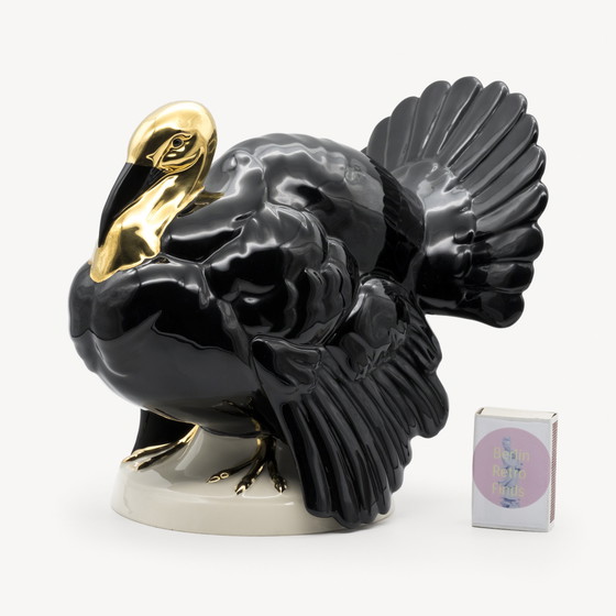 Eine beeindruckende und seltene Porzellan-Skulptur von **Goebel Westdeutschland**, die einen stolzen, voluminösen Truthahn in tiefem, glänzendem Schwarz mit luxuriösen Golddetails darstellt. Diese imposante Figur zeugt von der technischen Raffinesse und dem skulpturalen Anspruch, die Goebels Produktion in den 1970er und 1980er Jahren prägten – weit über die beliebten Figuren der Marke hinaus und hin zu großen, dekorativen Kunstobjekten.