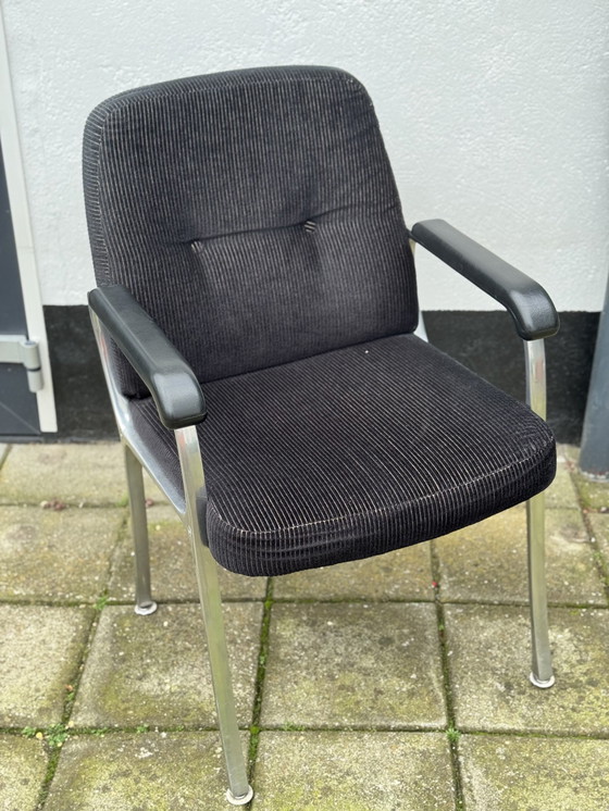 Dies ist ein wirklich schöner Stuhl im Bauhaus-Stil, hergestellt von Grahl aus Deutschland. Bei der Suche im Internet war es nicht möglich, einen Stuhl mit diesem speziellen Metallgussrahmen zu finden. Das deutet darauf hin, dass dieser Stuhl recht selten sein könnte. Es ist sehr gut konstruiert und gebaut, um zu halten. Er hat dunkelgrauen Samtstoff mit Lederbändern an den Armlehnen. Er sitzt gut und ist sehr bequem.