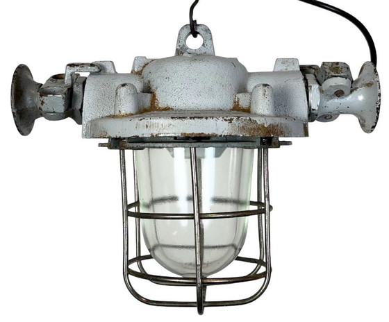 Diese Industrieleuchte wurde in den 1980er Jahren in Polen hergestellt. Sie besteht aus einem grauen Gusseisenkorpus, einem Eisenkäfig und bruchsicherem Glas. Die Porzellanfassung benötigt Standard-E27/E26-Glühbirnen. Das Kabel ist neu. Die Lampe wiegt 6,8 kg.