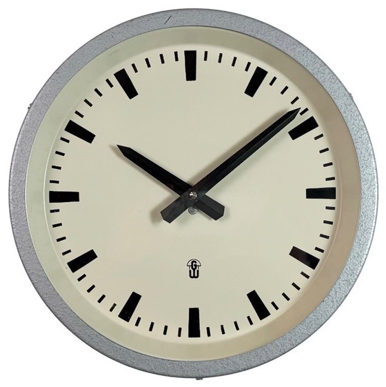 Industrielle Fabrikwanduhr, hergestellt in den 1960er Jahren in der ehemaligen DDR von GW (Gerätewerk Leipzig). Sie besteht aus einem grauen Eisenrahmen, einem Metallzifferblatt, Aluminiumzeigern und einer Glasabdeckung. Die Uhr wurde auf Batteriebetrieb umgerüstet und benötigt nur eine AA-Batterie. Ihr Durchmesser beträgt 30 cm, ihr Gewicht 1,3 kg.
