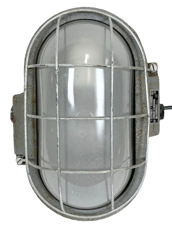 Industrielle Wandleuchte, hergestellt von Elektrosvit in der ehemaligen Tschechoslowakei in den 1970er Jahren. Sie besteht aus einem Gusseisenkorpus, einer Milchglasabdeckung und einem Stahlgitter. Die Porzellanfassung benötigt E27-Glühbirnen. Neues Kabel. Gewicht der Lampe: 5 kg.