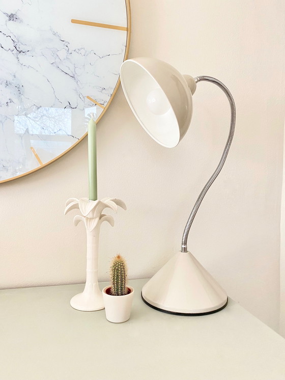 Große 1970 Industrial Style Schreibtisch / Tischlampe in Hellgrau & Beige mit einem flexiblen Chrom Schwanenhals