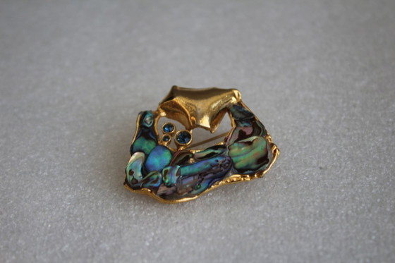 Diese einzigartige handgefertigte Brosche aus vergoldetem Metall besticht durch ihre kunstvollen Abalone-Einlagen und drei kleine, blaue geschliffene Steine. Ein wahres Unikat, das jedem Outfit einen Hauch von Eleganz und Individualität verleiht. Perfekt für Sammler und Liebhaber von außergewöhnlichem Schmuck.