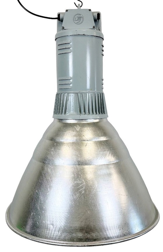 Diese Pendelleuchte wurde von Elektrosvit hergestellt und ursprünglich in den 1960er Jahren in Fabriken der ehemaligen Tschechoslowakei eingesetzt. Sie besteht aus einem Aluminiumkorpus und einem Lampenschirm aus Aluminiumguss. Die Leuchte ist voll funktionsfähig und verfügt über eine neue Porzellanfassung (E27/E26) sowie ein neues Kabel. Sie wiegt 7,2 kg und hat einen Durchmesser von 68 cm.
