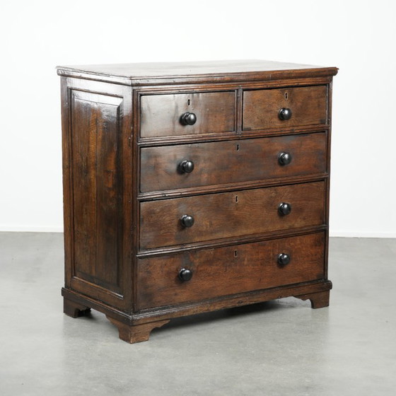 Angeboten wird diese große und imposante antike englische Eichenkommode aus dem frühen 18. Jahrhundert mit 5 Schubladen.