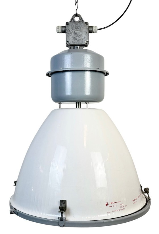 Diese industrielle Pendelleuchte wurde in den 1990er-Jahren von Elektrosvit in der Slowakei hergestellt. Sie verfügt über einen weißen Emaille-Schirm, einen grau lackierten Aufsatz mit einem Gehäuse aus Aluminiumguss und einer klaren Glasabdeckung. Die neue Porzellanfassung benötigt Standard-E27/E26-Glühbirnen. Das Kabel ist neu. Die Lampe wiegt 12 kg. Der Schirm hat einen Durchmesser von 55 cm.