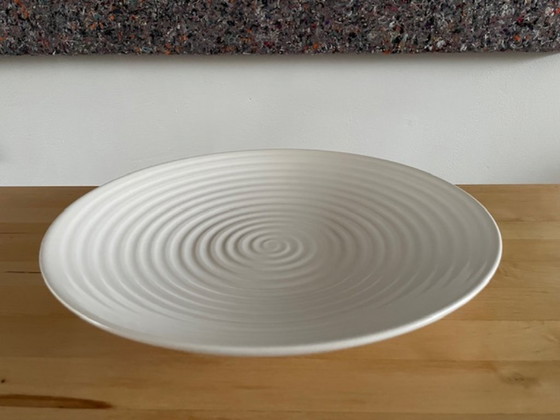 Große, repräsentative Servierschüssel des finnischen Designunternehmens Pentik. Weiße Keramik mit ringförmiger, geriffelter Oberfläche, in exzellentem Zustand mit minimalen Gebrauchsspuren. Durchmesser 35 cm, Höhe 5 cm, Gewicht 1,7 kg.