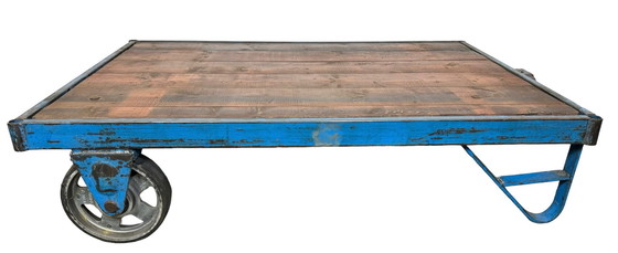 Ein ehemaliger Palettenwagen aus einer Fabrik dient nun als Couchtisch. Er besteht aus blauem Eisen, hat zwei Originalräder und eine massive Holzplatte. Der Tisch wiegt 40 kg.