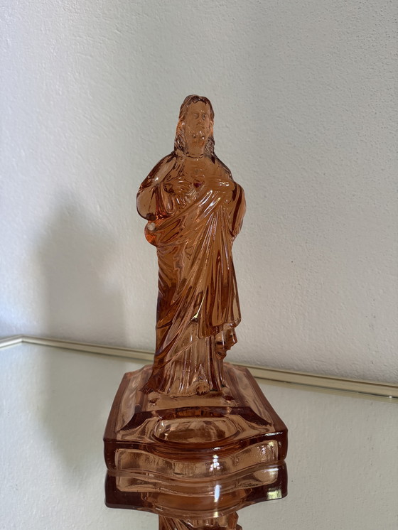 Originelle, große Skulptur aus gepresstem Glas aus den 30er/40er Jahren (Art Déco-Periode) eines Christus mit heiligem Herzen in rosa/orangen Farbtönen, je nach Lichteinfall, mit einem Kerzenhalter auf der Rückseite, der einen schönen Effekt auf dem Glas bietet; sehr guter Allgemeinzustand (leichte Patina der Zeit, insbesondere auf alten Spuren von Polychrom auf dem Herzen und dem Kreuz auf der Rückseite); ideal als schönes Devotionalienobjekt, Kuriositätenkabinett oder schräge Dekoration...