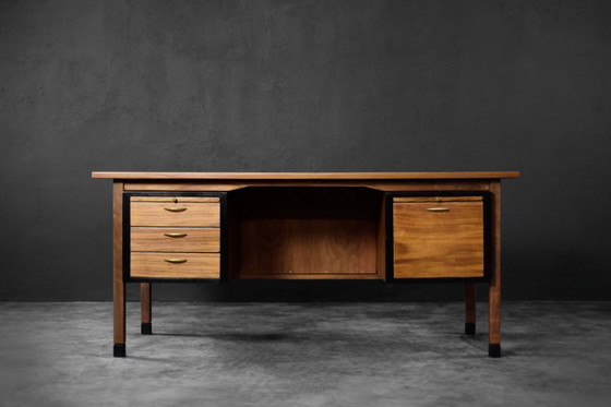 Dieser moderne Schreibtisch wurde in den 1960er-Jahren in Dänemark gefertigt. Er ist aus naturbelassenem Teakholz in einem warmen Braunton mit sichtbarer Maserung gefertigt. Links befinden sich drei geräumige Schubladen, ideal zur Aufbewahrung von Dokumenten, Büromaterial und anderen kleinen Accessoires. Rechts bietet ein großer, tiefer Schubladenblock ausreichend Platz für größere Büroartikel oder Elektronik. Ein weiterer Vorteil sind die zwei ausziehbaren Arbeitsplatten, jeweils eine über jeder Schubladenreihe, die bei Bedarf eine schnelle Erweiterung der Arbeitsfläche ermöglichen. Dieses praktische Merkmal ist bei modernen Möbeln äußerst selten. Besonders hervorzuheben ist die Rückseite des Schreibtisches mit ihrer markanten, geometrischen Formgebung. Dadurch wirkt der Schreibtisch doppelseitig. Die leicht vorspringenden Rückwände verbinden moderne Formen mit klassischem Art-déco-Stil. Der kontrastierende schwarze Rahmen um die Schubladenfronten und den Korpus betont die Geometrie des Möbels und verleiht ihm gleichzeitig einen eleganten, grafischen Charakter. Zusammen mit der natürlichen Holzmaserung und den dezenten Messinggriffen ergibt sich ein harmonisches und ästhetisch ansprechendes Gesamtbild. Dieses zeitlose Möbelstück besticht durch sein elegantes Design, seine solide Konstruktion und seine hochwertige Verarbeitung. Der Schreibtisch vereint klassisches Design mit Funktionalität und ist somit eine perfekte Ergänzung für viele Einrichtungsstile.