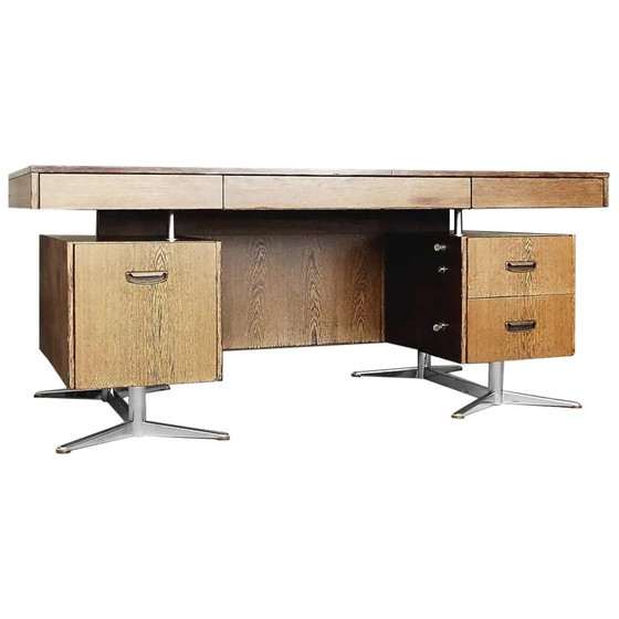 Dieser große, freistehende und zweiseitige Chefschreibtisch wurde in den 1960er Jahren von HR in Deutschland hergestellt. Der Schreibtisch ist aus exotischem Wengeholz und Furnier mit einer sehr starken Maserung gefertigt und hat ein verchromtes Metallgestell mit fünf Schubladen, einschließlich zwei Schlüsseln. Der Schreibtisch ist wirklich groß und schwer, hat eine geräumige Platte und voluminöse Schubladen. Originaler Vintage-Zustand.