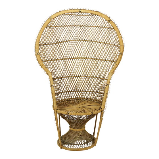 Großer Vintage-Pfauenstuhl im Boho-Stil, Pfauenstuhl, besser bekannt als Emanuelle-Stuhl, ganz aus Weidengeflecht, Rattan und Holz, unten mit der Aufschrift Fabriqué aux Philippines, Designobjekt im Bohème-Stil aus der zweiten Hälfte des 20. Jahrhunderts. Dieses große Modell wurde für Erwachsene hergestellt, es gibt sie in verschiedenen Größen und Formaten und sie werden auch oft für Puppen oder Kinder hergestellt. Aus Rattan und geflochtener Weide, schönes Vintage-Design und qualitativ hochwertig verarbeitet, ein echter Hingucker, ein Kissen wird für zusätzlichen Komfort empfohlen. Dieser niedliche Stuhl ist in schönem Vintage-Zustand, mit leichten altersgemäßen Gebrauchsspuren, ein weißer Farbspritzer oben rechts, siehe Fotos für mehr Details! Abmessungen: LBH 87x52x131cm, Sitzhöhe: 40cm. Gewicht: 2,3kg.