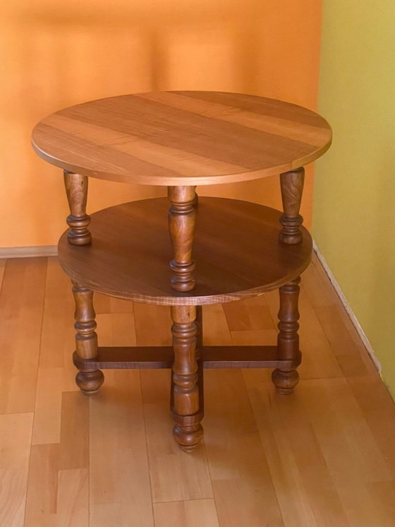 Wunderschöner Tisch in maximal behaglich warmen Farbton. Er ist sehr gut verarbeitet und stabil. Die gedrechselten Beine erinnern an Schachfiguren und schaffen einen angenehm reizvolles Spiel für die Augen. Der Tisch sieht aus wie neu.