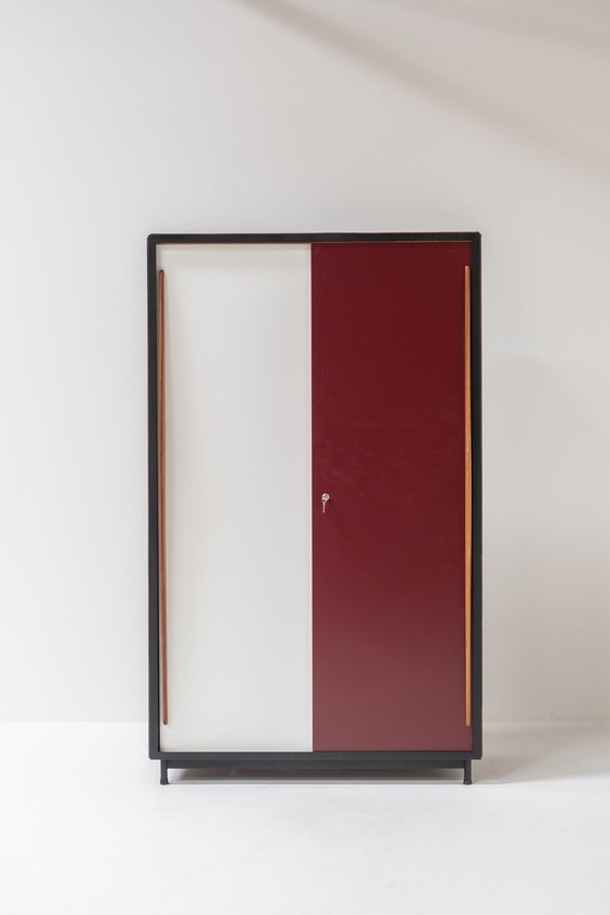 Dieser große Standschrank, der 1952 von Willy Van Der Meeren für Tubax entworfen wurde, ist eine echte Ikone des belgischen Designs der Jahrhundertmitte. Mit seinen Schiebetüren aus weißem und warmrotem Metall mit eleganten Holzgriffen bietet er ein perfektes Gleichgewicht zwischen industrieller Funktionalität und raffinierter Ästhetik. Van der Meeren, der für seinen innovativen und sozial bewussten Ansatz bekannt war, schuf Möbel, die sowohl modern als auch zugänglich waren und einen bleibenden Einfluss auf das europäische Design hinterließen. Dieses besondere Stück wurde von einem professionellen Atelier in den Niederlanden komplett renoviert, so dass es sich in einem ausgezeichneten Zustand befindet und seinen ursprünglichen Charakter bewahrt hat. Eine auffällige und zeitlose Ergänzung für jedes Interieur.