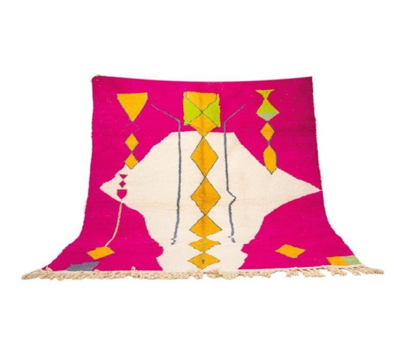 Verschönern Sie Ihr Zuhause mit diesem exquisiten Teppich im Beni-Ourain-Stil, gefertigt aus luxuriöser marokkanischer Schafwolle. Mit seinen großzügigen Maßen von 3 x 2 Metern ist dieser Teppich ein wahres Meisterwerk, das traditionelle Handwerkskunst mit modernem Flair vereint. Der markante rosa Hintergrund ist mit geometrischen Mustern in Weiß, Gelb und Grün verziert und macht ihn zu einem faszinierenden Blickfang, der in jedem Raum zum Mittelpunkt wird.