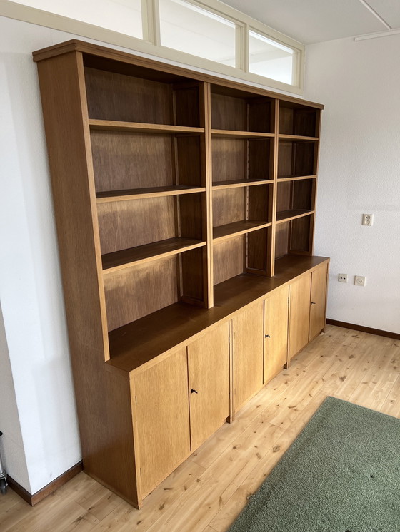 Großes Bücherregal aus den 1960er Jahren. Handgefertigt, Schrank wurde von einem Möbelmacher gemacht. Die Regale sind aus massiver Eiche. Länge 242 cm. Höhe 198 cm. Tiefe 42 cm. Der Schrank hat einige Sonnenverfärbungen und wurde demontiert. Einzigartiger Schrank, Preis €1295,00.