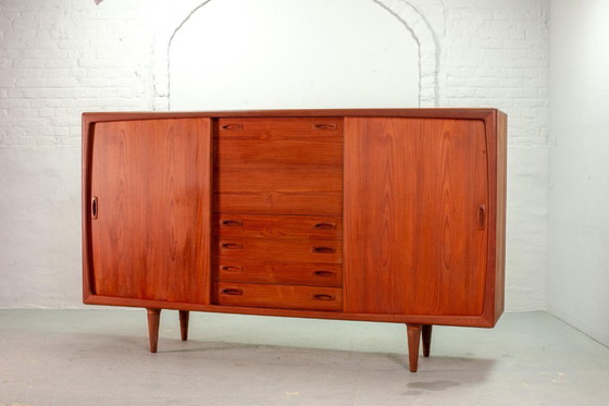 Großes dänisches Highboard aus massivem Teakholz im Mid-Century-Design, hergestellt von HP Hansen in den 1960er Jahren. Dieses hochwertige skandinavische Sideboard verfügt über zwei große Teakholz-Schiebetüren, hinter denen sich zwei Fächer mit je drei Einlegeböden verbergen. Zwischen dem linken und rechten Fach befindet sich ein Schreibtisch mit einem integrierten Einlegeboden und vier Schubladen. Dieses elegante und zugleich robuste Sideboard bietet viel Stauraum und ist in einem hervorragenden Zustand. Höhe: 130 cm, Breite: 218 cm, Tiefe: 50 cm