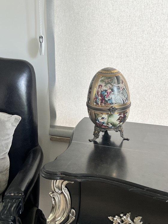 Ein exquisites Limoges-Ei, ein Meisterwerk der Porzellankunst. Das mit aufwendigen handgemalten Szenen verzierte Dekorationsobjekt versprüht den Charme des Klassizismus und ist damit eine perfekte Ergänzung für jede raffinierte Sammlung. Das Ei ist wunderschön mit goldenen Details verziert und ruht anmutig auf einem Messingständer, der seinem ohnehin schon atemberaubenden Erscheinungsbild noch einen Hauch von Opulenz verleiht.