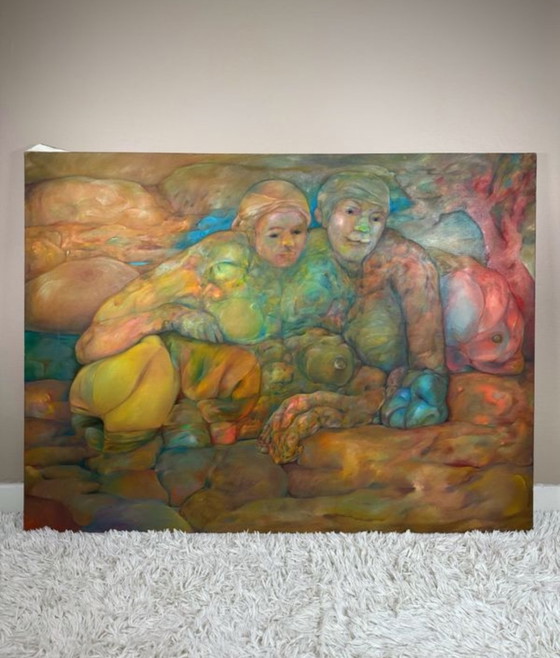 Großes Gemälde, Ölgemälde oder Acrylmischung, mehrfarbig, nicht signiert (Künstler zu identifizieren), aber gut ausgeführt; wahrscheinlich aus den späten 90er Jahren, sehr guter Allgemeinzustand.