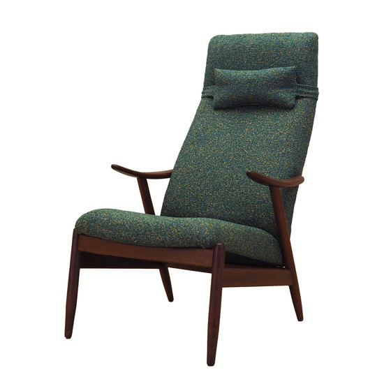 Die Beine sind aus massivem Teakholz gefertigt. Der Sessel wurde einer Polsterung unterzogen, der Stoff wurde durch einen neuen Stoff ersetzt. Die Polsterung wurde in grünem, hochwertigem Melange-Stoff ausgeführt.